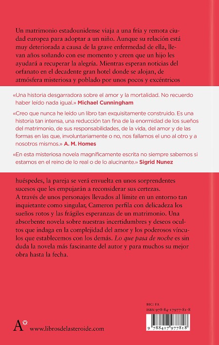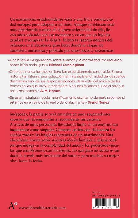 Un matrimonio estadounidense viaja a una fría y remota ciudad europea para adoptar a un niño. Aunque su relación está muy deteriorada a causa de la grave enfermedad de ella, llevan años soñando con ese momento y creen que un hijo les ayudará a recuperar la alegría. Mientras esperan noticias del orfanato en el decadente gran hotel donde se alojan, de atmósfera misteriosa y poblado por unos pocos y excéntricos huéspedes, la pareja se verá envuelta en unos sorprendentes sucesos que les empujarán a reconsiderar sus certezas.A través de unos personajes llevados al límite en un entorno tan inquietante como singular, Cameron perfila con delicadeza los sueños rotos y las frágiles esperanzas de un matrimonio. Una absorbente novela sobre nuestras incertidumbres y deseos ocultos que indaga en la complejidad del amor y los poderosos vínculos que establecemos con los demás. Lo que pasa de noche es sin duda la novela más fascinante del autor y para muchos su mejor obra hasta la fecha.