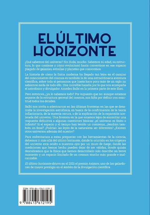 Balbi nos invita a adentrarnos en las últimas fronteras en las que se desarrolla la investigación astrofísica, en busca de la confirmación de la teoría inflacionaria, de la materia oscura, o de la explicación de la expansión acelerada del universo. Una frontera en la que estamos lejos de encontrar una respuesta definitiva a algunas cuestiones básicas: ¿el universo es finito o infinito? Si el espacio y el tiempo han tenido un comienzo, ¿tendrán también un final? ¿Podrían las leyes de la naturaleza ser diferentes? ¿Existen otros universos además del nuestro?