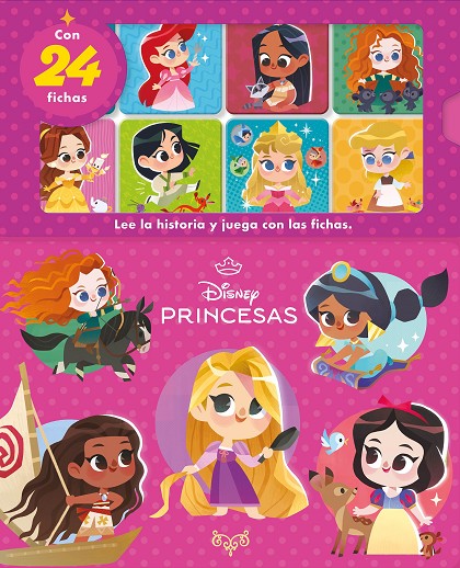Lee el libro y busca entre las 24 fichas a las Princesas Disney que salen en cada página. Cuando hayas terminado, ¡coloca todas las fichas bocabajo y diviértete jugando al memory!